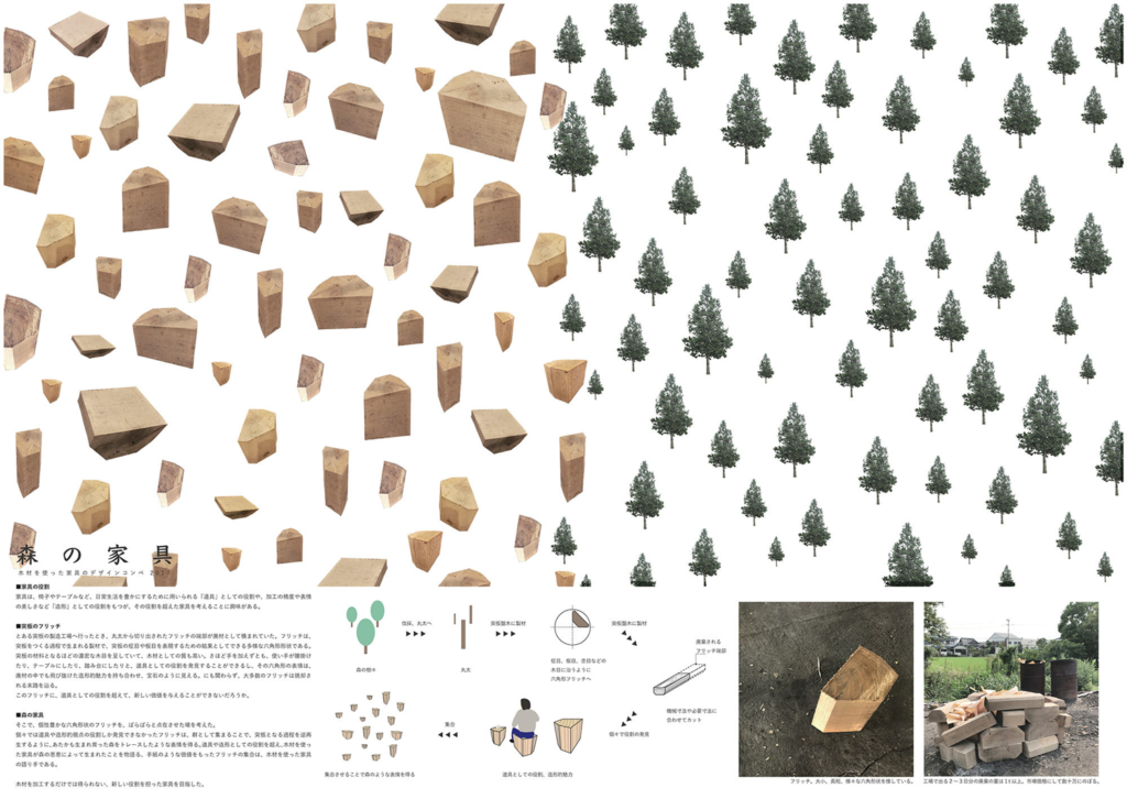そこで、個性豊かな六角状のフリッチを、ぱらぱらと点在させた場を考えた。ここでは造形的視点の役割しか発見できなかったフリッチは、群として集まることで、突板となる過程を逆再生するように、あたかも生まれ育った森をトレースしたような表情を得る。道具や造形としての役割を超え、木材を使った家具が森の恩恵によって生まれたことを物語る、手紙のような価値をもったフリッチの集合は、木材を使った家具の語り手である。