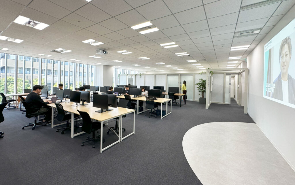 オフィスの中心となるスクリーンはもともとあった中央の大きな壁面を活用.レーザープロジェクターにより大画面の映像を投影し普