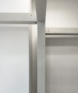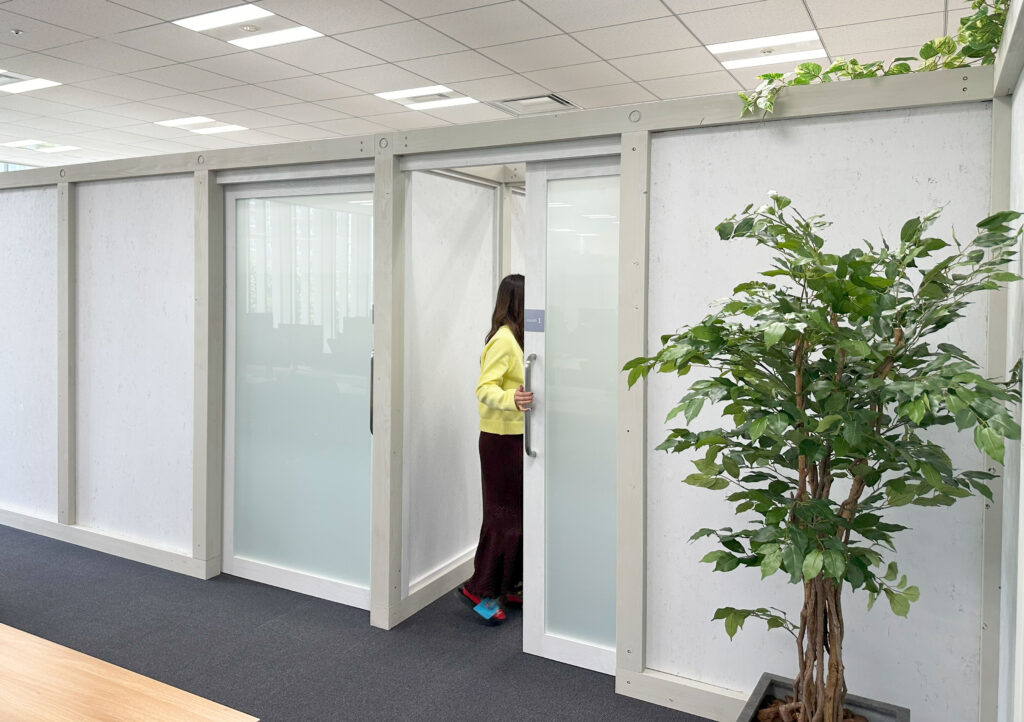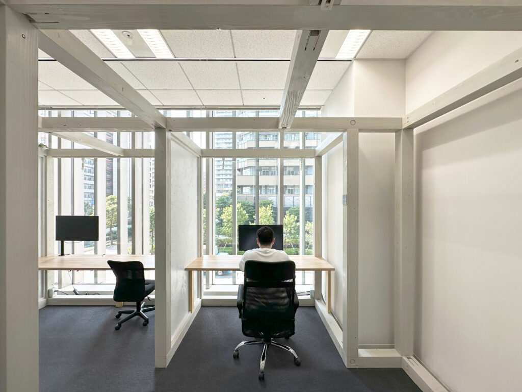 移転先のビルを訪れた際に、既存の空間が持つ壁面と出入口、窓からなるシンメトリーさと明確な前後を有する構成が、どこかシアター
