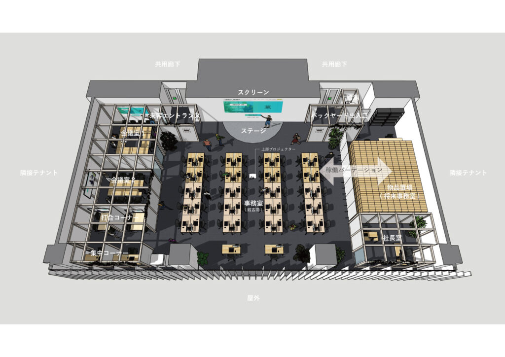 段のオフィス空間をそのまま大きな会議やイベントスペースとして用いることが出来ます.各スペースへは中央の事務室=シアターから出入りするレイアウトとすることで社員同士が一体感をもって働ける様に計画しました。